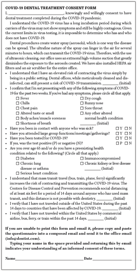 Tidak di bawah standar perawatan untuk tidak menawarkan persetujuan berdasarkan informasi COVID-19. Formulir tersebut merupakan alat manajemen risiko untuk mencegah kesalahpahaman oleh pasien, dokter gigi, atau staf. Beberapa orang menyatakan bahwa akan sangat sulit untuk memberikan pertanggungjawaban kepada dokter gigi jika pasien tertular COVID-19 langsung dari kantor gigi. Yang lain mengatakan mungkin saja menghubungkan gejala pasien ke klinik gigi dengan mencocokkan jenis virus. Terlepas dari sudut pandang ilmiah atau politik Anda, Anda perlu melakukan yang terbaik untuk pasien, staf, dan diri Anda sendiri.