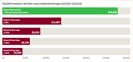 Anda mungkin bertanya-tanya, apa yang harus saya lakukan dengan investasi pensiun saya? Haruskah saya tetap di pasar? Jawaban yang mudah adalah "ya". Seperti yang ditunjukkan bagan di sini, masuk dan keluar pasar membuat Anda cenderung kehilangan keuntungan pasar utama, bahkan jika Anda kebetulan hanya mendapatkan uang tunai selama 10 hari selama 15 tahun terakhir. Sasaran Anda haruslah "waktu di pasar", bukan "waktu pasar" untuk hasil terbaik.